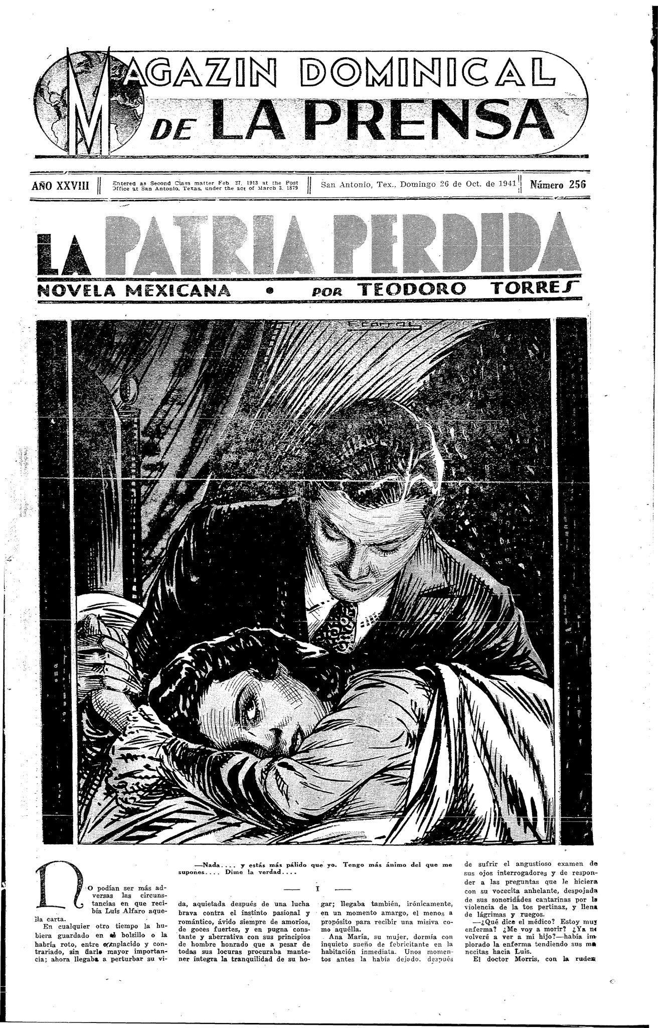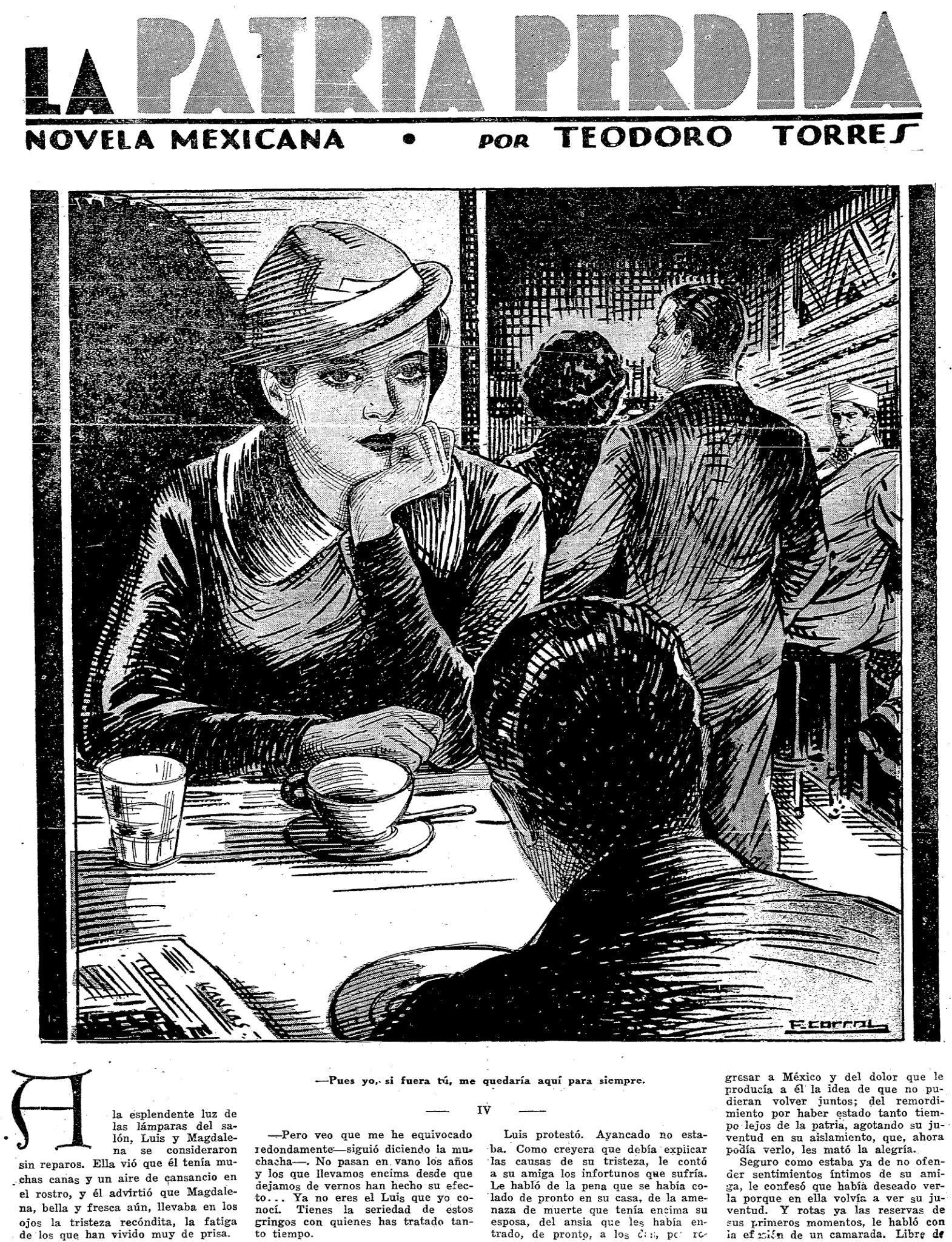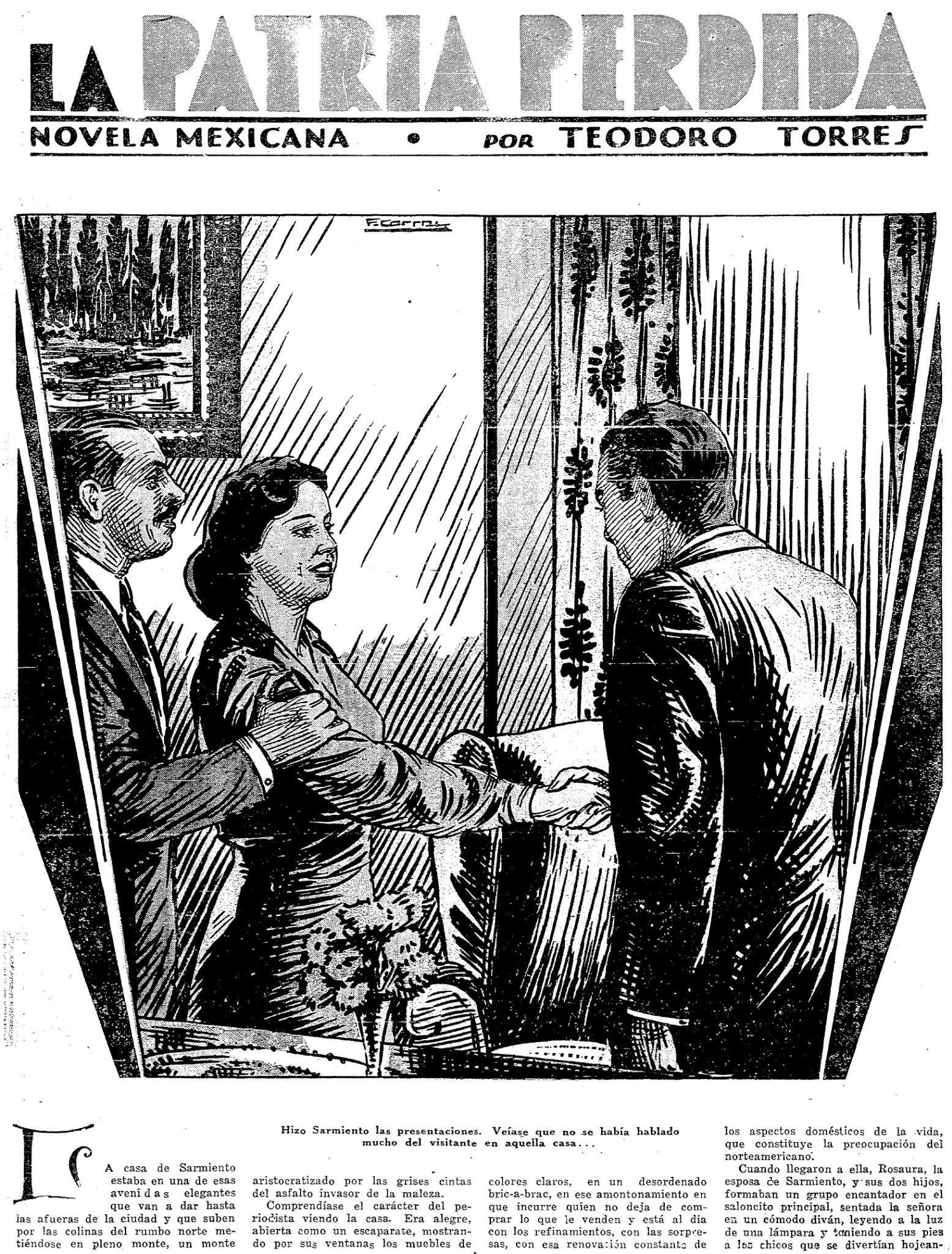 En 1931 la política volvió a enredar a Teodoro Torres. Su constante oposición al régimen revolucionario (esto, durante la época de la Ley Calles) le obligó a renunciar al puesto de editor [de Revistas de Revistas], [y] al mundo periodístico por completo. . . . Las vacaciones forzadas del trabajo periodístico le dieron a Teodoro Torres, por fin, algo de tiempo libre para dedicarse a la novela que había empezado unos años antes . . . La patria perdida. (McCann 10–11)