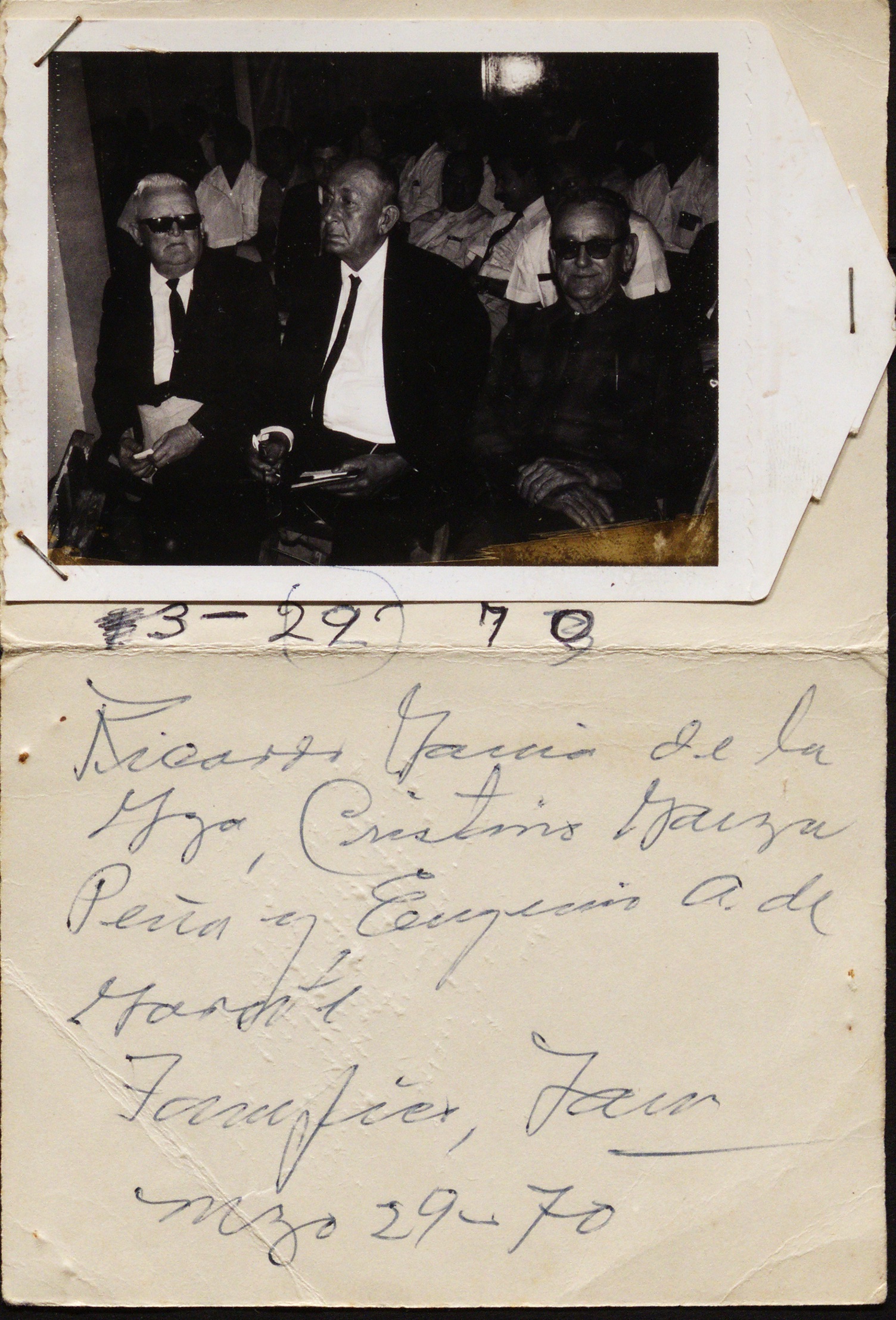 Conservar el archivo, preservarlo, cuidarlo e interpretarlo es algo que ha gustado mucho hacer a la señora Santos. Lo que le preocupa cuando lo ve es no acordarse de los nombres, rostros, incluso de las notas que ella misma ha dejado ahí. Le preocupa la memoria. Su memoria. Por eso, se ha encargado de generar sus propias marcas o señalamientos que le den un poco de pistas cuando el olvido o la confusión acechan. En las fotografías, señala a su padre sobre la frente o encima de su cabeza con una pequeña flecha, paloma o Papa, que ha puesto con un bolígrafo. La señal sobre él es otra forma de nombrarlo. Algunas veces, el señalamiento se encuentra cerca de una firma que podría ser de Don Cristino. De esta manera, se asegura de recordar el rostro de ese hombre que, conforme pasan los años, comienza a perderse entre los rostros de aquellos que se encuentran a su alrededor.