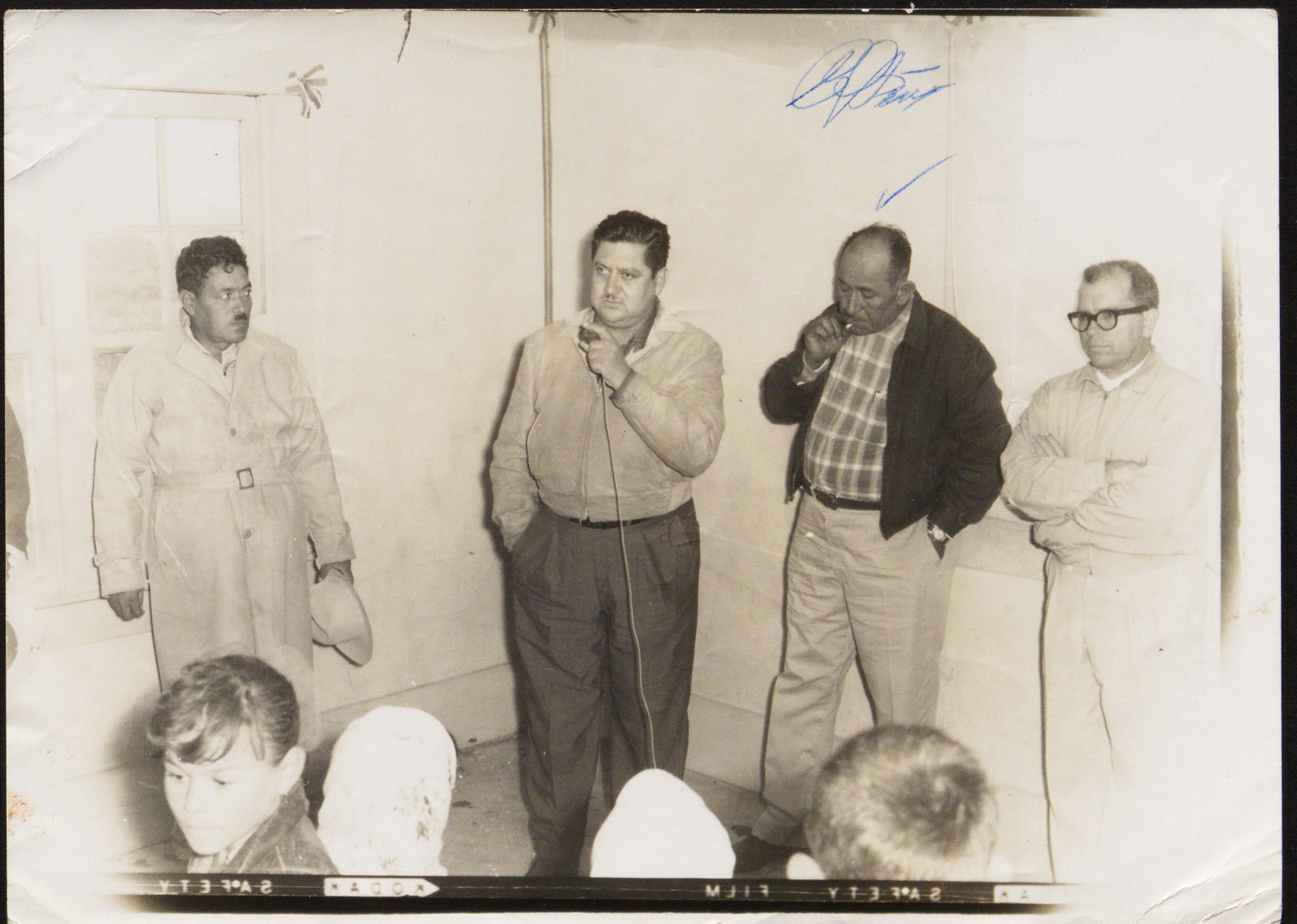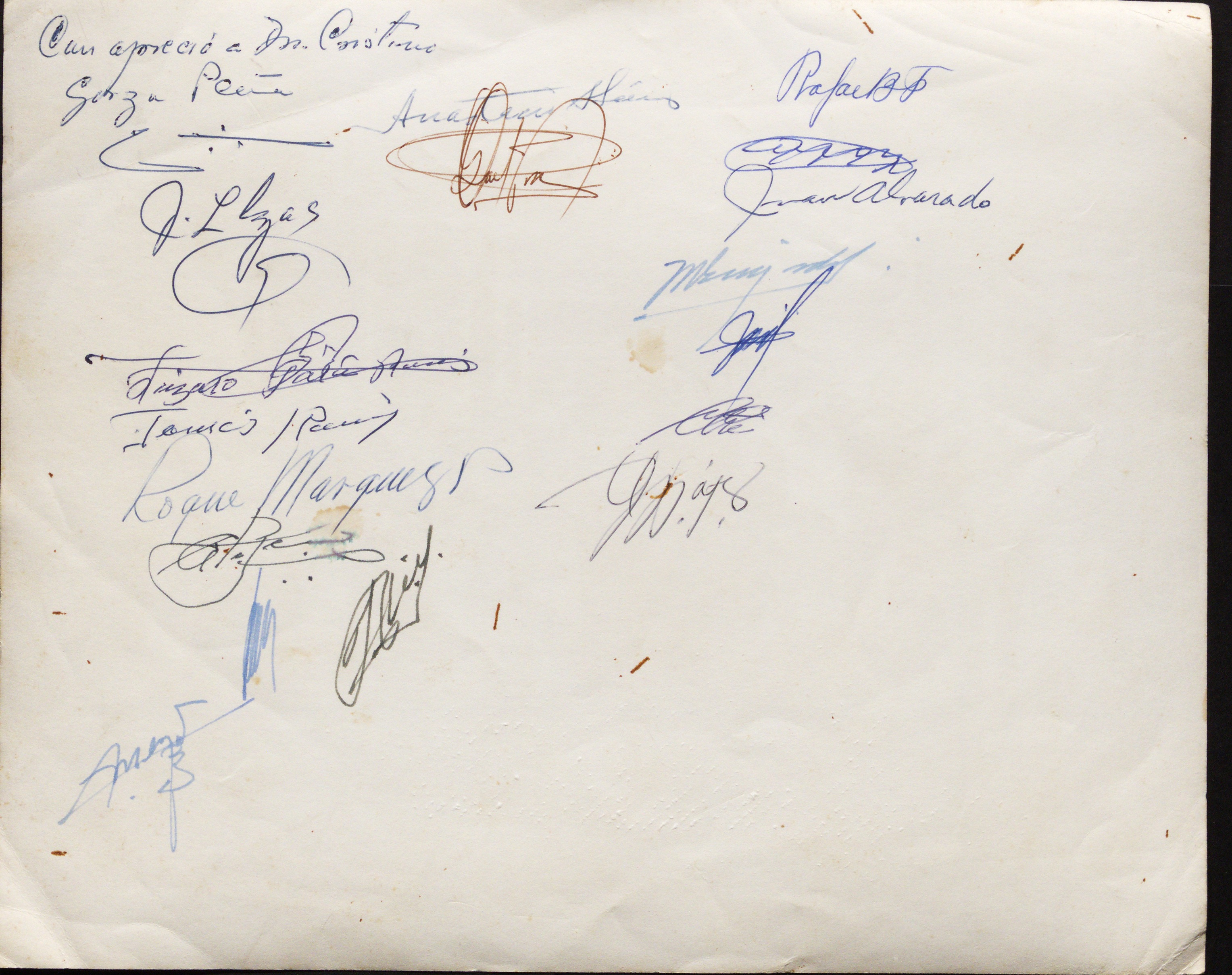 Una serie de firmas que dejan huella de todas las personas que estuvieron ahí. Cada uno firmó la fotografía para asegurar su presencia, asistencia y, sin querer, preservación de su nombre a través del tiempo. Firmas que les identifican, dan nombre y demuestran la congregación. El pulso y tacto de aquellos hombres que asistieron una tarde a una asamblea. Ante esta firma “comunitaria” de archivo me pregunto ¿cuántas otras formas de aparecer pueden existir en estos documentos más allà del retrato? ¿cómo estas presencias, en tinta, significan el nacimiento de otra búsqueda? ¿Cómo la rayadura, la anotación, la intervención pueden ser una forma de memoria? ¿Cómo estas intervenciones se convierten en una especie de converesación intergeneracional?