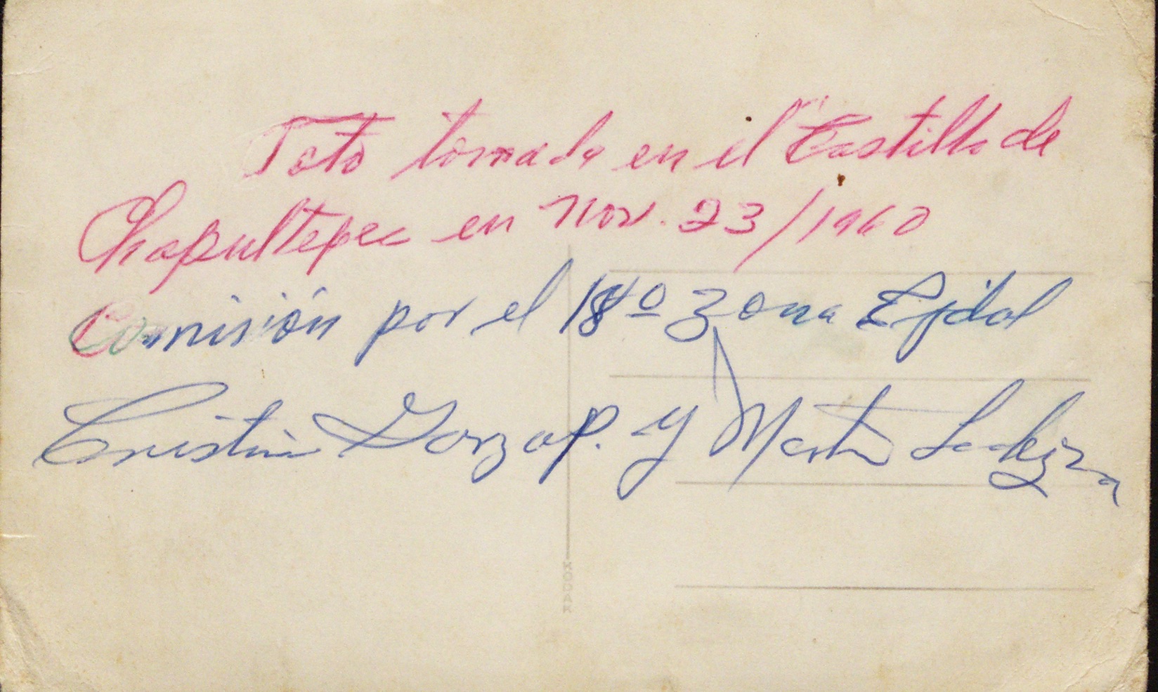 Pareciera que es un recuerdo que alguien regaló. Otro alguien o quizá el mismo que preparó el recuerdo, se aseguró de registrar los nombres de quien ahí aparece. Parece que esta foto ha tenido varias intervenciones. Las tintas de la fecha son de diferentes colores.