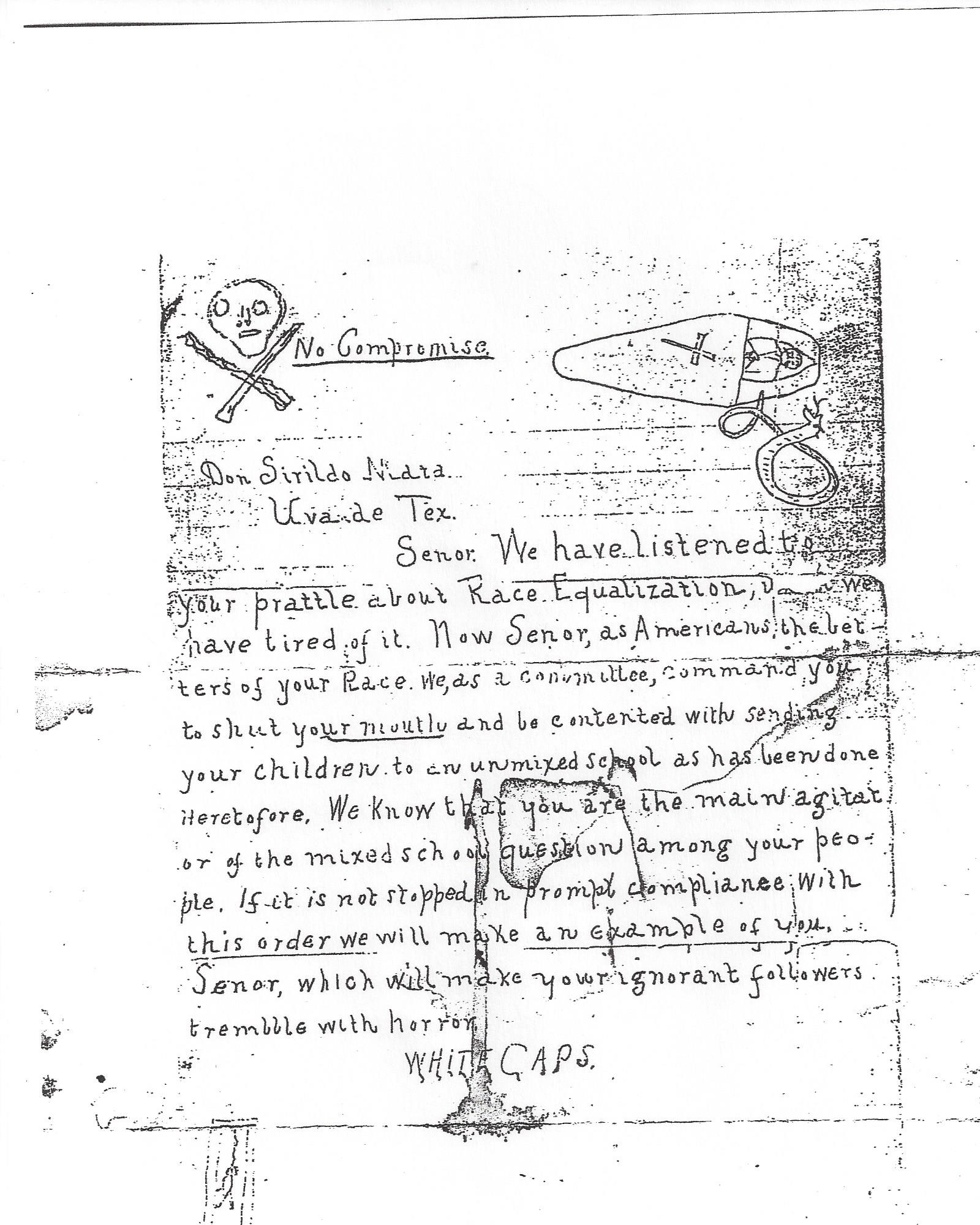 Letter from White Caps to Ciriclio Mata, courtesy of Maria del Carmen Ibarra Iruegas, personal archive. ↑